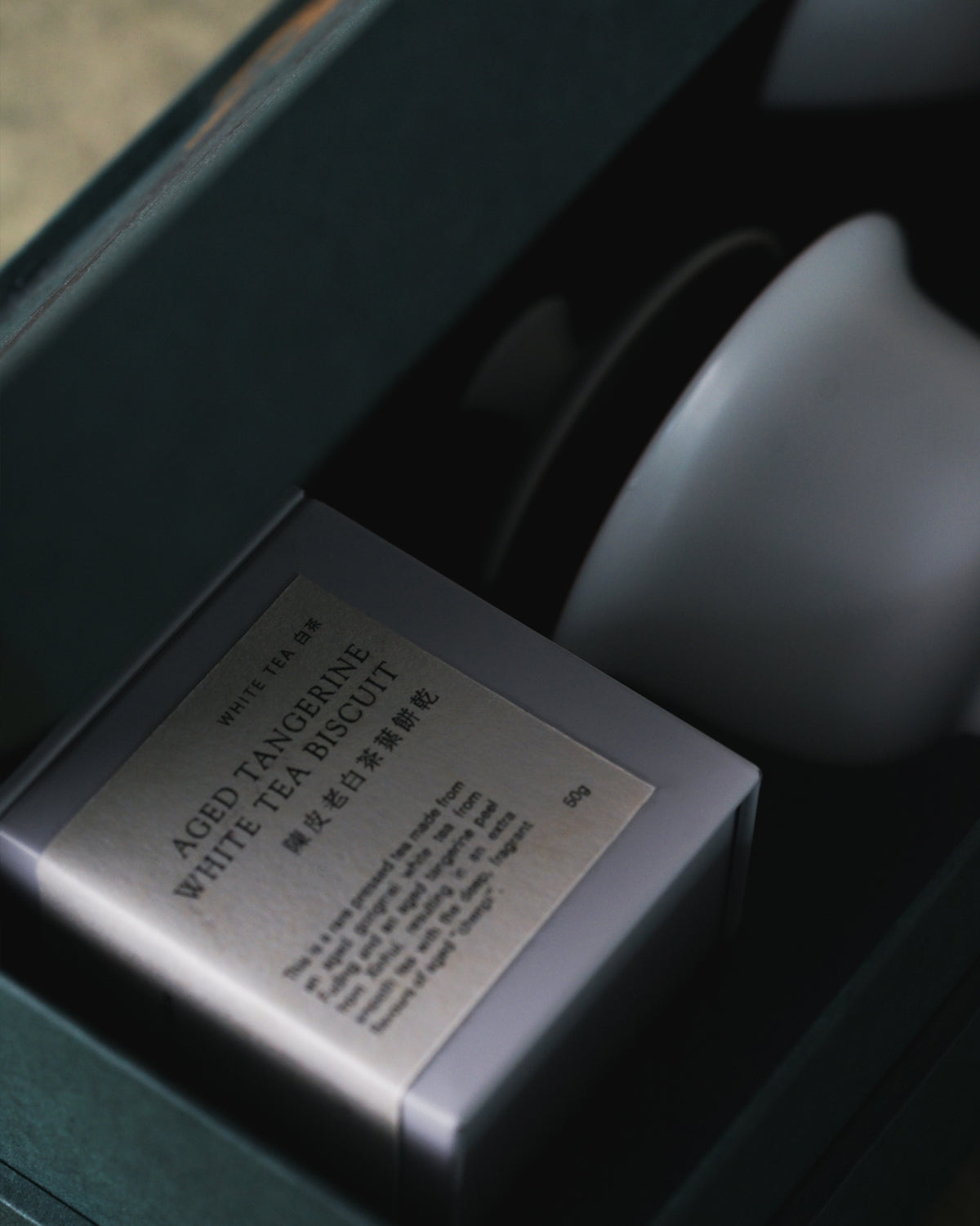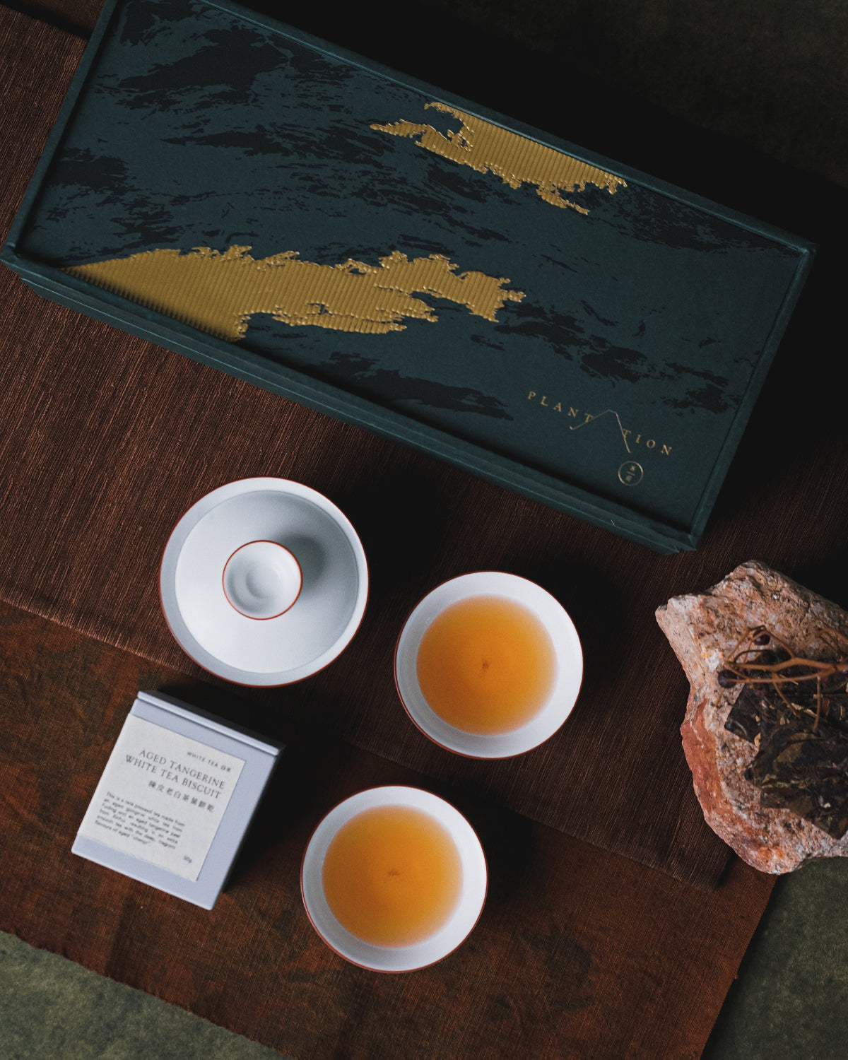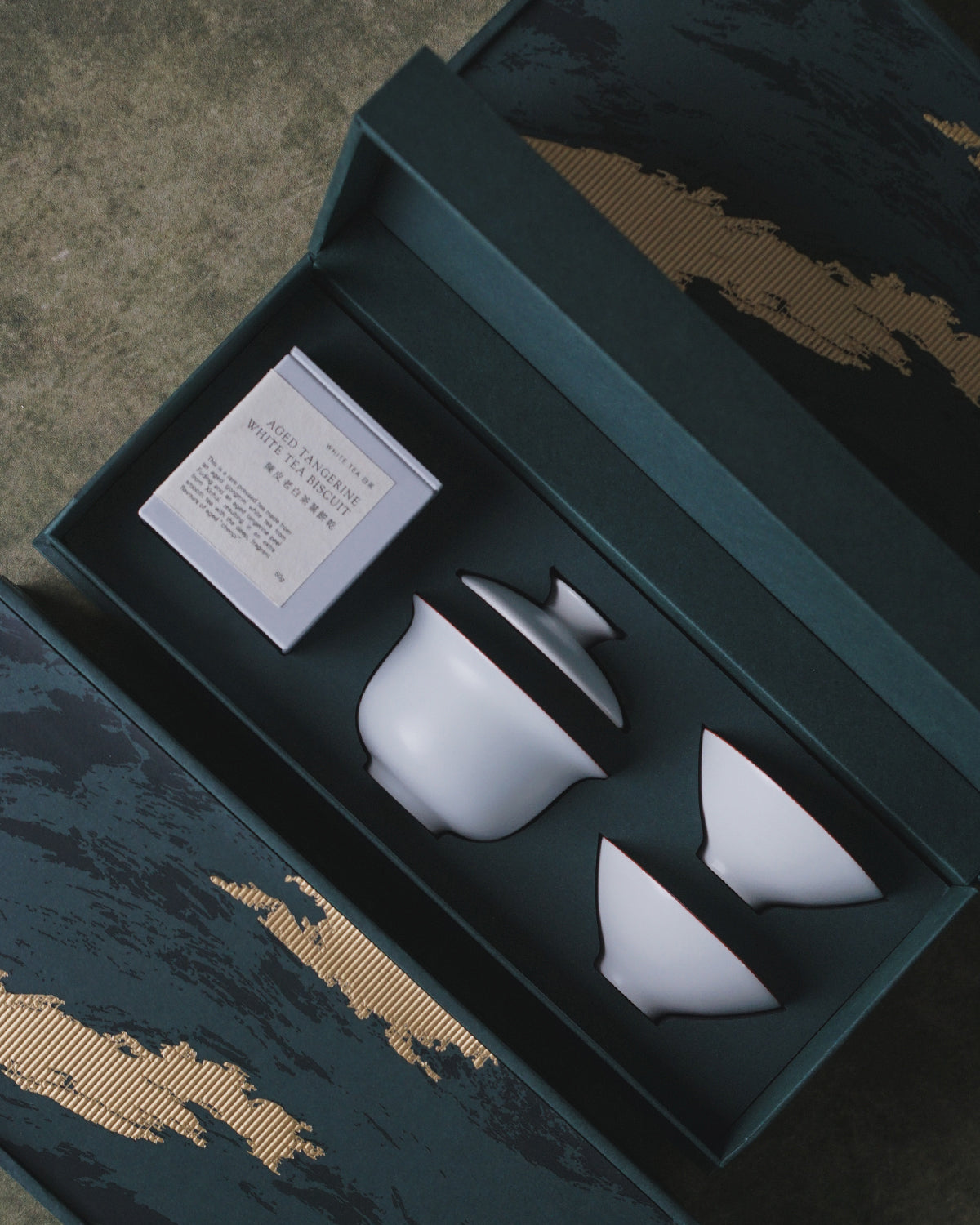The design inspiration for the gift box complements the Aged Tangerine White Tea, drawing on the traces left by nature over time. Much like the folding ridges of mountains and the weathered grain of wood, they all symbolize the rich and fragrant years. The gift box also includes a Matte White Ceramic Gaiwan and teacup set, allowing the tea brewing experience to blend into daily life
