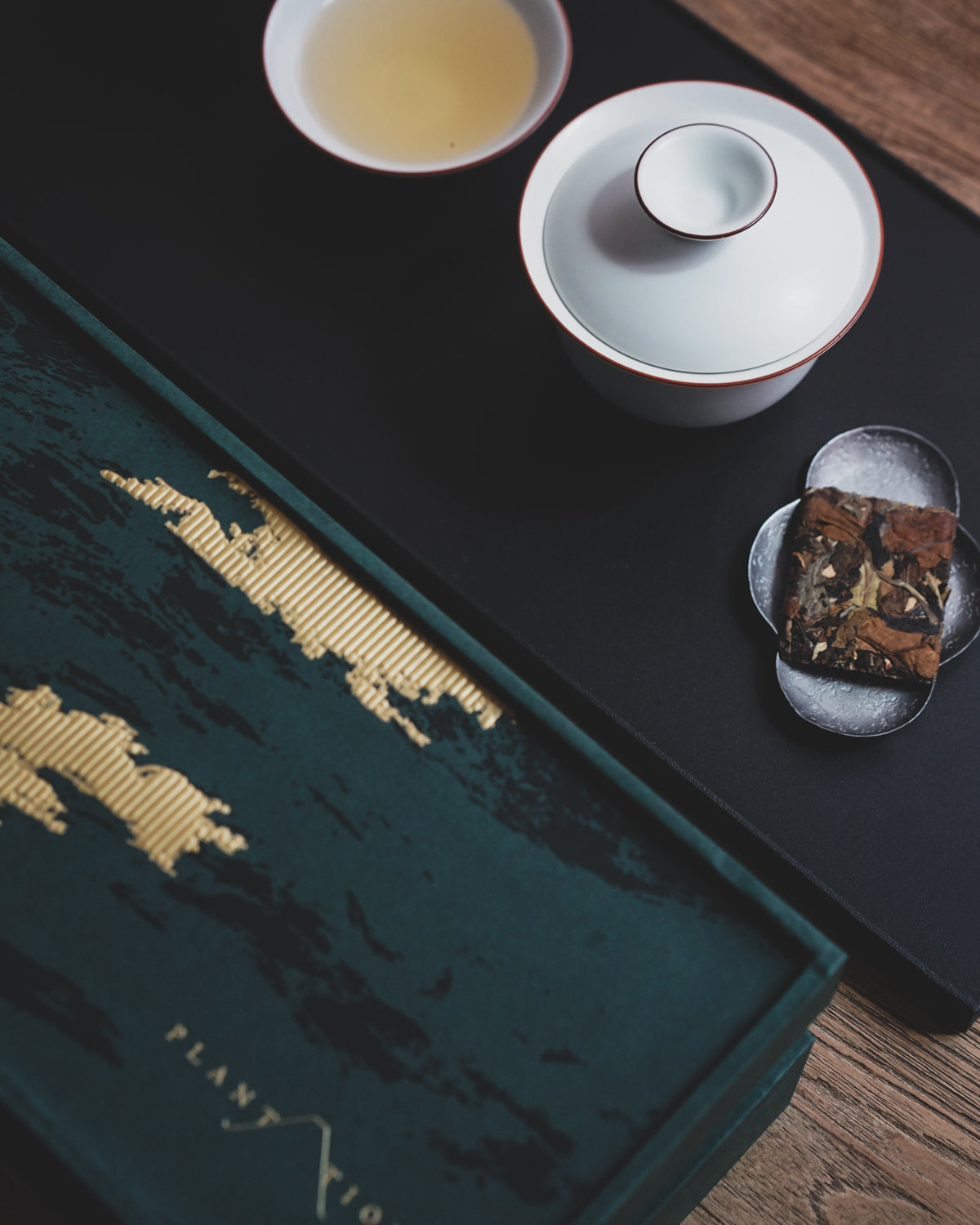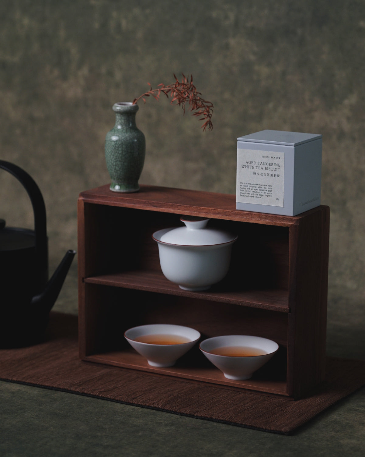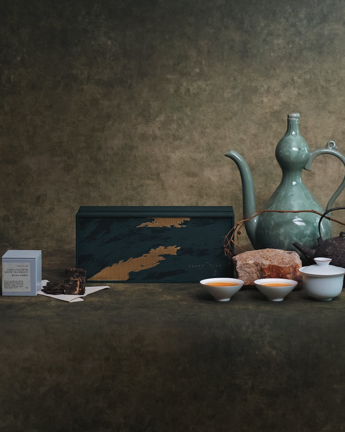 The design inspiration for the gift box complements the Aged Tangerine White Tea, drawing on the traces left by nature over time. Much like the folding ridges of mountains and the weathered grain of wood, they all symbolize the rich and fragrant years. The gift box also includes a Matte White Ceramic Gaiwan and teacup set, allowing the tea brewing experience to blend into daily life